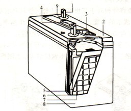 1一接線端子;2一蓋;3~安全閥;4一極柱;5一正極板;6一隔板;7一負(fù)極板;8--#b.殼;9一端子膠